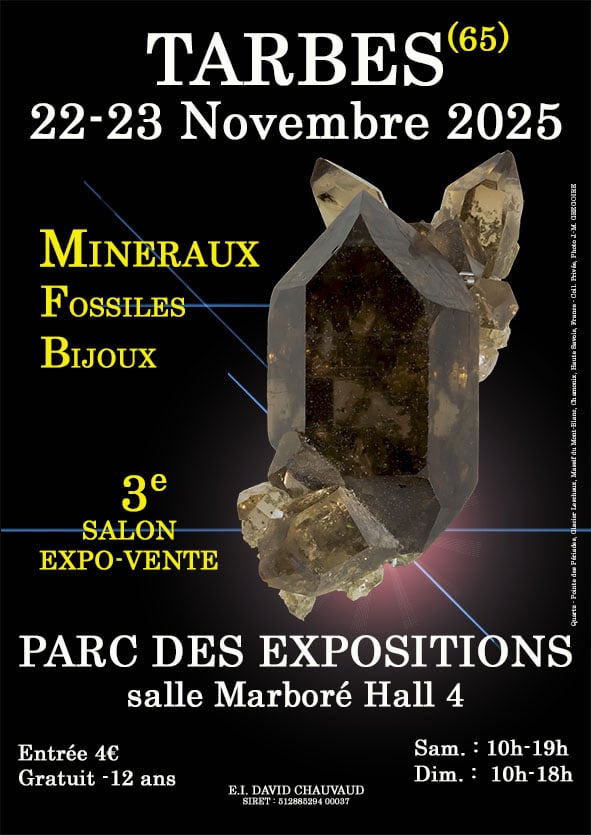 HEXAGONE MINERAL vous donne rendez-vous les 22 et 23 novembre 2025 à TARBES (Hautes-Pyrénées) pour le 3e SALON MINERAUX FOSSILES BIJOUX. Cet événement se déroulera dans la SALLE MARBORE (Hall 4) du PARC DES EXPOSITIONS situé sur le Boulevard du Président Kennedy. Pour animer cet événement, entre 20 et 25 exposants professionnels et amateurs, connus pour la qualité de leur stand seront présents. Ces spécialistes montreront aux visiteurs leurs dernières nouveautés en provenance du monde entier, des quatre coins de France et bien sûr des Pyrénées. Pour répondre toujours plus aux attentes du public, un service d'expertise gratuite sera aussi proposée par l'organisateur à celles et ceux qui souhaitent faire déterminer leurs découvertes minéralogiques ou paléontologiques. Les  collectionneurs comme les curieux pourront découvrir à cette occasion de nombreux minéraux et fossiles provenant de la chaîne des Pyrénées avec de belles surprises sorties des collections pour l'occasion. Ce salon ravira les collectionneurs toujours à la recherche de spécimens esthétiques et rares et émerveillera à coup sûr les néophytes et les plus jeunes en les sensibilisant au patrimoine minéralogique de la région.