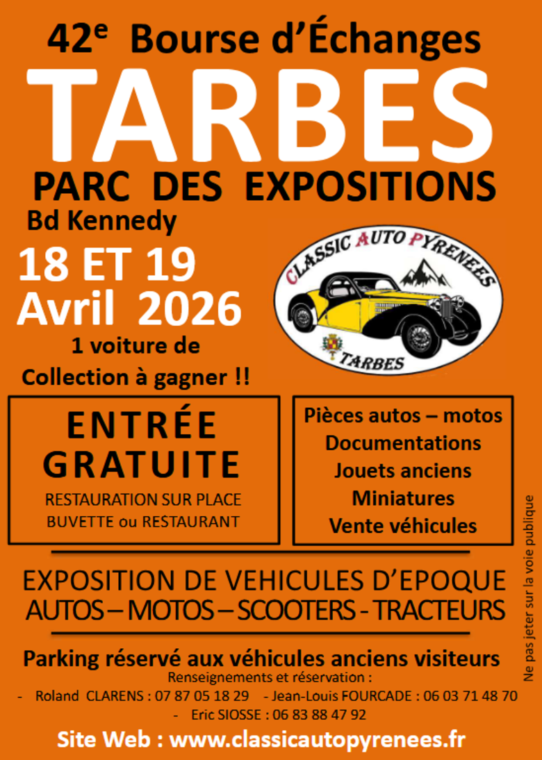 Du 10 avri 2026 au 12 avri 2026 Salon des Séniors et Forum des Aidants Du 18 avri 2026 au 19 avri 2026 42ème Bourse d'Echanges Tarbes Du 23 avri 2026 au 26 avri 2026 Camping-Car Tour Du 15 mai 2026 au 17 mai 2026 Braderie Sports Loisirs 1 2 3