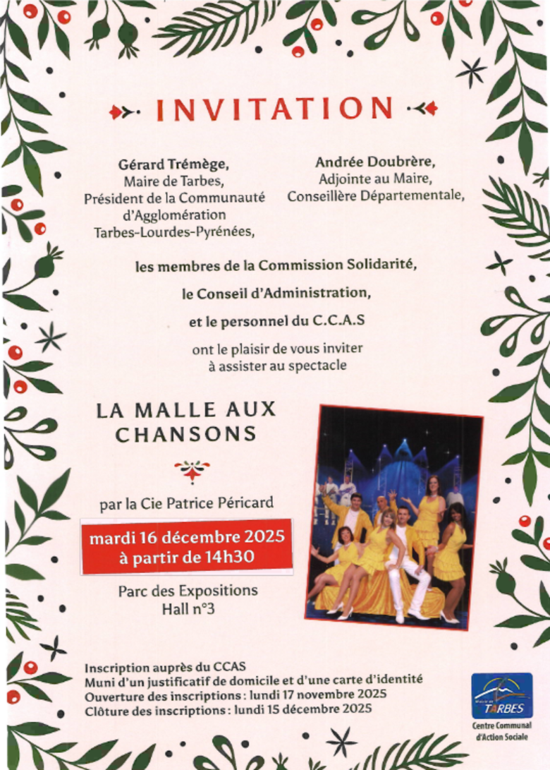 Du 06 déce 2025 au 07 déce 2025 Tarbes Geek Festival Le 06 déce 2025 Gala de l'ENIT Le 07 déce 2025 Tournoi de Noël Le 12 déce 2025 Soirée de fin d'année Le 13 déce 2025 Arbre de Noël du département Du 13 déce 2025 au 04 janv 2026 Luna Park Le 16 déce 2025 Noël des séniors Le 18 déce 2025 Grand Thé Dansant Le 06 janv 2026 Grand Thé Dansant Du 17 janv 2026 au 18 janv 2026 Salon du mariage, du PACS et de la fête Le 17 janv 2026 Show Magic Boys Du 22 janv 2026 au 01 févr 2026 Les Petits As 1 2 3